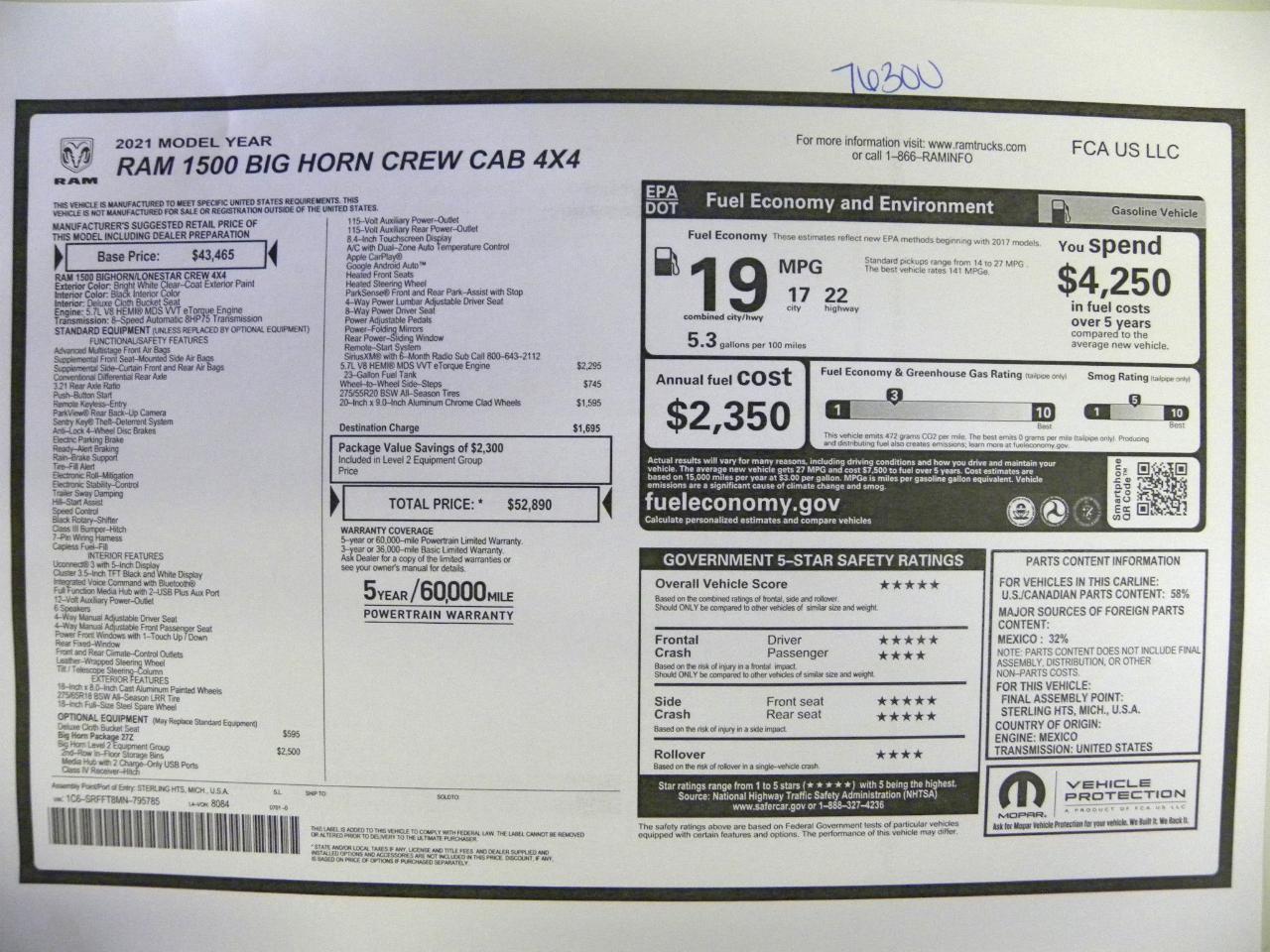 Hop into this sleek White 2021 RAM 1500 and get ready for an adventure! With a 3.21 Rear Axle Ratio and Part And Full-Time Four-Wheel Drive, this truck is ready to tackle any terrain. The Engine Auto Stop-Start Feature ensures you're maximizing fuel efficiency, while the GVWR of 6,900 lbs means you can load up all your gear with ease. The Transmission w/Driver Selectable Mode gives you ultimate control on the road, and the Trailer Wiring Harness is perfect for towing your toys. This RAM 1500 also features a reliable 730CCA Maintenance-Free Battery, perfect for those long road trips.